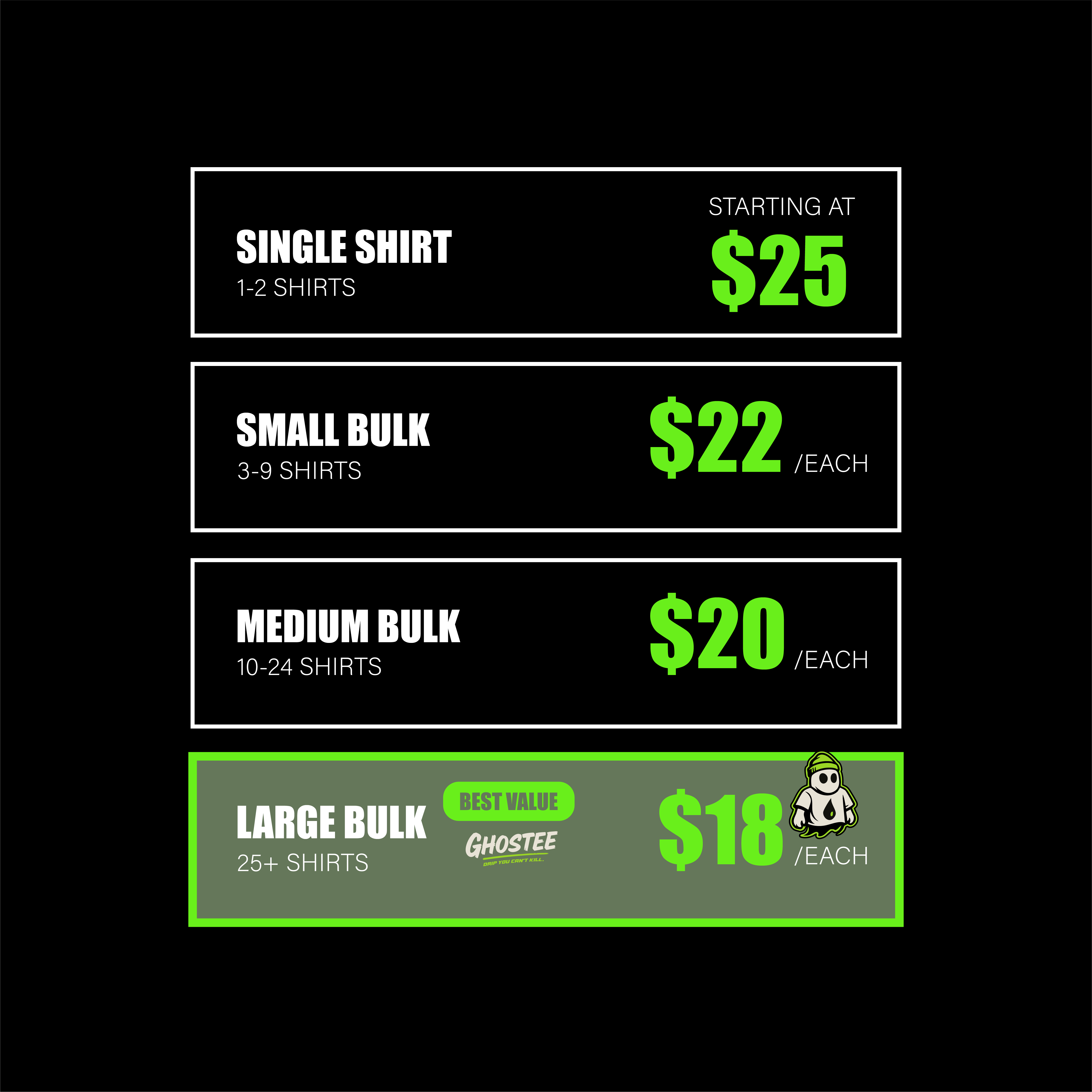 At Ghostee, we specialize in high-quality custom apparel printing. Based in Texas, we deliver bold, durable prints with fast turnaround and no minimums. Whether you're a brand, artist, or business, Ghostee helps you stand out with every piece.